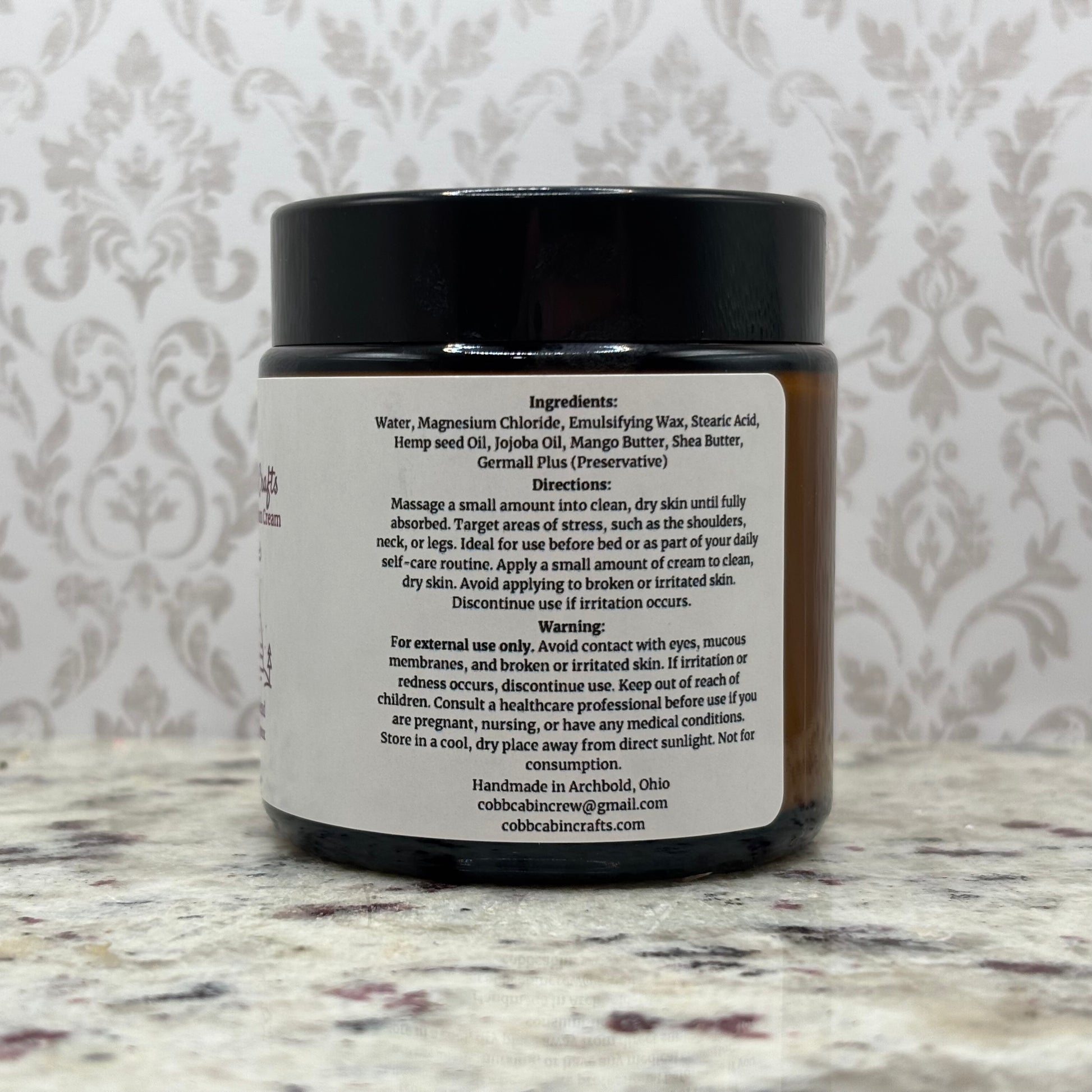 Ingredients: Water, Magnesium Chloride, Emulsifying Wax, Stearic Acid, Hemp seed Oil, Jojoba Oil, Mango Butter, Shea Butter, Germall Plus (Preservative)